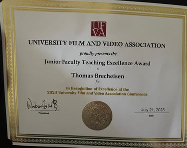 The University Film and Video Association is an internationally recognized teaching and media organization that serves our creative media faculty and students. I was honored to be the 2023 recipient of the Junior Faculty Teaching Excellence award.
