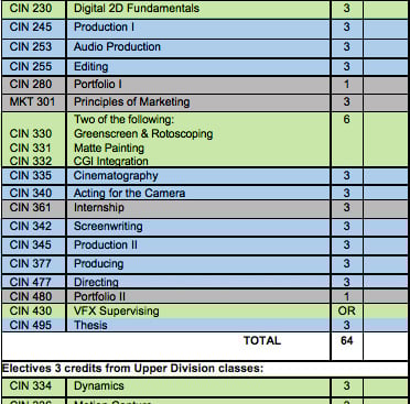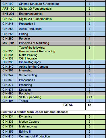 At Missouri Western State University, I was in charge to drafting a new and advanced BAA in Cinematic Arts. There we collaborated with our Fine Art's Digital Art's program and incorporated advanced VFX courses in our Cinema program. Students also had to take several business classes (Entrepreneurship and Marketing), as well as two Portfolio courses.